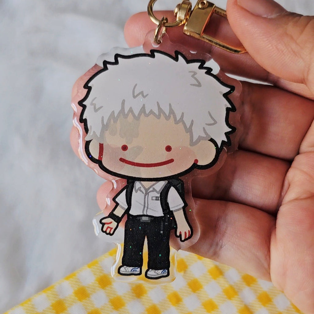 These keychains have double sided print with glitter epoxy on one side and regular acrylic on the other side. It has a gold coloured hoop attachment.